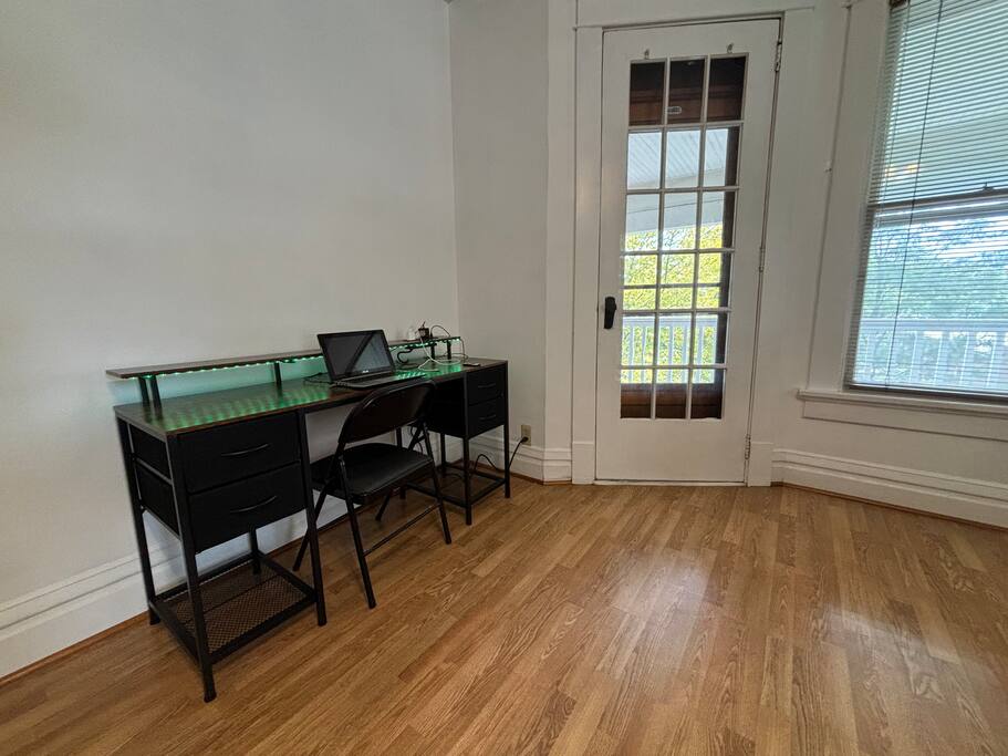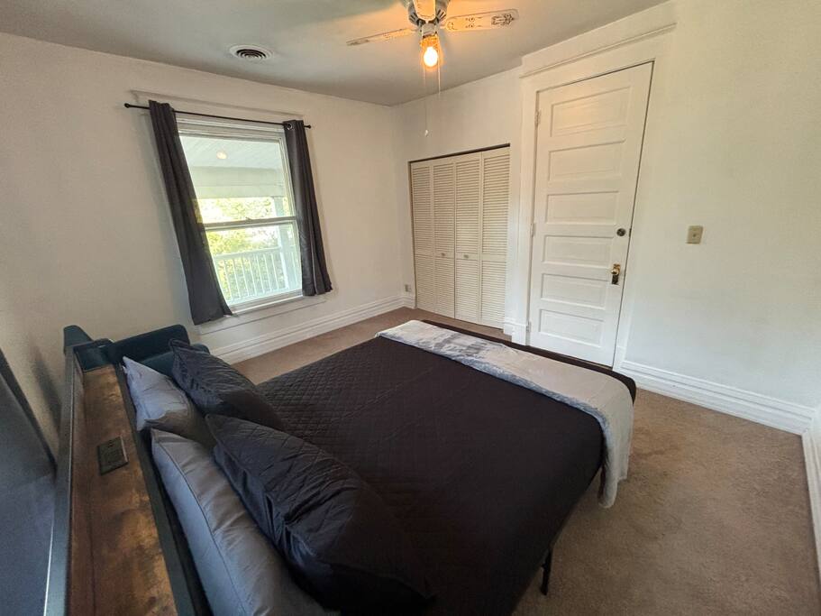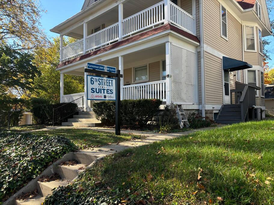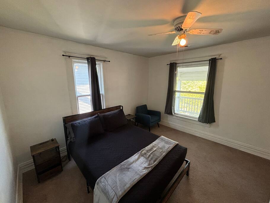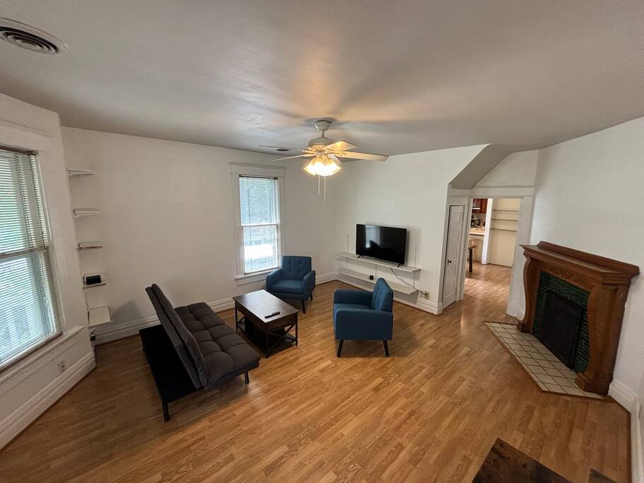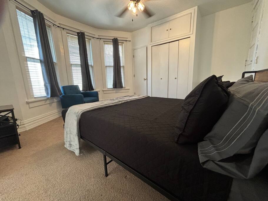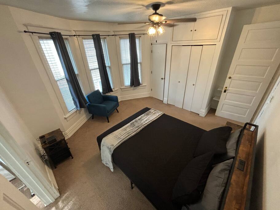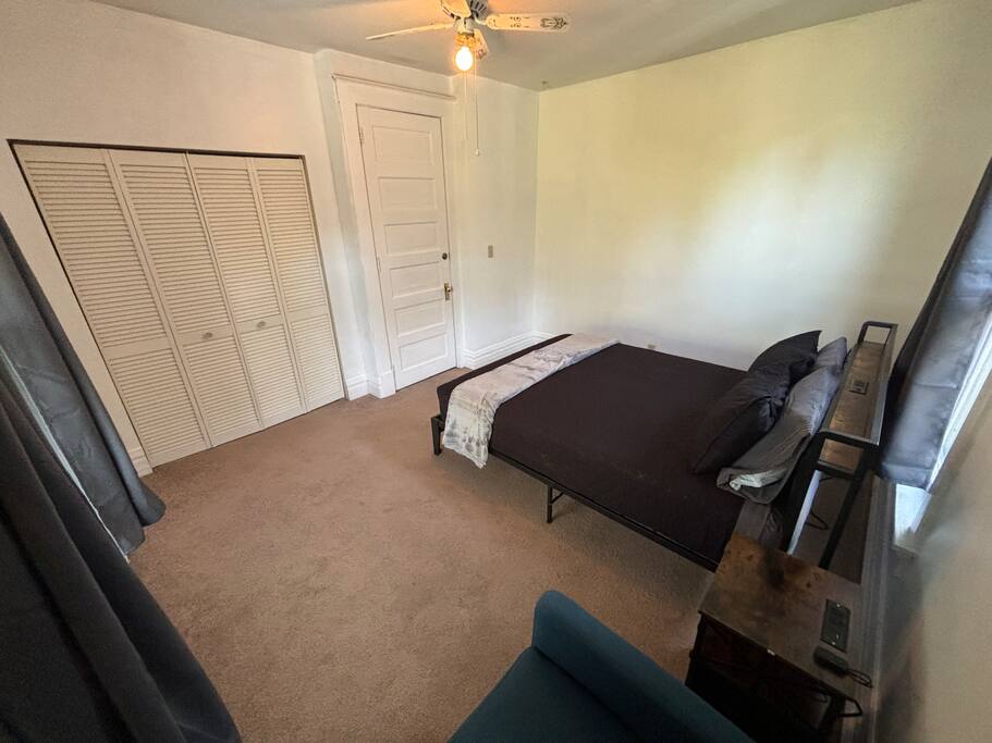 This is a full, private second-floor apartment in a historic 1891 building located in the Farrington Grove Historic District of Terre Haute. Your group will enjoy easy access to everything in Terre Haute—the suite is about 1.5 miles from Indiana State University and downtown, making it convenient for classes, events, dining, and shopping. The space is ideal for students, travelers passing through, working professionals, and families who need separate, private spaces for sleeping and working. You’ll have a full kitchen, comfortable living area, and private bedrooms so everyone can spread out and relax. Wi-Fi and TV are available so you can work remotely, stream, or study. The property follows Indiana and Terre Haute rental safety requirements, including working smoke alarms (and CO alarms if fuel-burning appliances/garage apply) and basic habitability standards. Justia Law +2 Pye-Barker Fire & Safety +2 Professional cleanings are scheduled through Turno, so a vetted cleaner is assigned and confirmed before each new stay. Each room has a queen size bed, sheets, blankets,large closet, end tables, and a chair.